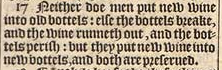 17 Neither doe men put new wine into old bottels: else the bottels breake, and the wine runneth out, and the bottels perish: but they put new wine into new bottels, and both are preserued.
