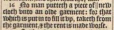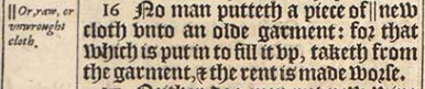 16 No man putteth a piece of || new cloth vnto an olde garment: for that which is put in to fill it vp, taketh from the garment, & the rent is made worse. [||Or, raw, or vnwrought cloth.]