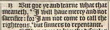 13 Aber geht ihr und lernt was das bedeutet, *'Ich will Gnade und keine Opfer': Denn ich bin nicht gekommen, die Rechtschaffenen zu rufen, *sondern Sünder zur Reue."[*Hosea 6:6 Matthäus 12:7 *1. Timotheus 1:15]