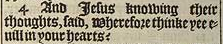 4 And Iesus knowing their thoughts, said, Wherefore thinke yee euill in your hearts?