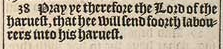 38 Pray ye therefore the Lord of the haruest, that hee will send foorth labourers into his haruest.