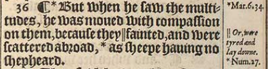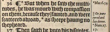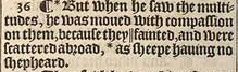 36 ¶ *But when he saw the multitudes, he was moued with compassion on them, because they || fainted, and were scattered abroad, *as sheepe hauing no shepheard.[*Mar.6.34. , ||Or, were tyred and lay downe. , * Num.27.17.]