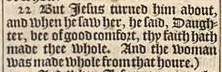 22 But Iesus turned him about, and when he saw her, he said, Daughter, bee of good comfort, thy faith hath made thee whole. And the woman was made whole from that houre.)