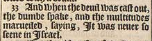 33 And when the deuil was cast out, the dumbe spake, and the multitudes marueiled, saying, It was neuer so seene in Israel.