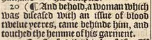 20 (¶ And behold, a woman which was diseased with an issue of blood twelue yeeres, came behinde him, and touched the hemme of his garment.