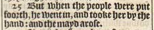 25 But when the people were put foorth, he went in, and tooke her by the hand: and the mayd arose.