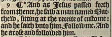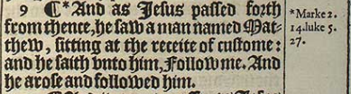 9 ¶ *And as Iesus passed forth from thence, he saw a man named Matthew, sitting at the receite of custome: and he saith vnto him, Follow me. And he arose and followed him.[*Marke 2.14. luke 5.27.]