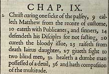 2 Christus heilt einen, erkrankt an Lähmung, 9 ruft Matthäus vom Zollamt, 10 isst mit Zöllnern und Sündern, 14 verteidigt seine Jünger dafür, nicht zu fasten, 20 heilt die Ruhr 23 erweckt Jairus' Tochter von den Toten, 27 gibt zwei blinden Männern Augenlicht, 32 heilt einen stummen Mann, besessen von einem Teufel, 36 und hat Mitleid mit den Scharen.