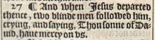 27 ¶ And when Iesus departed thence, two blinde men followed him, crying, and saying, Thou sonne of Dauid, haue mercy on vs.