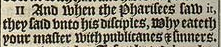 11 And when the Pharisees saw it, they said vnto his disciples, Why eateth your master with publicanes & sinners.