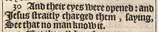 30 And their eyes were opened: and Iesus straitly charged them, saying, See that no man know it.