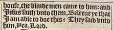 28 And when he was come into the house, the blinde men came to him: and Iesus saith vnto them, Beleeue ye that I am able to doe this? They said vnto him, Yea, Lord.