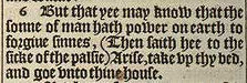 6 But that yee may know that the sonne of man hath power on earth to forgiue sinnes, (Then saith hee to the sicke of the palsie) Arise, take vp thy bed, and goe vnto thine house.