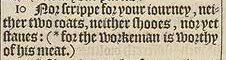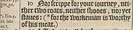 10 Nor scrippe for your iourney, neither two coats, neither shooes, nor yet staues: ( *for the workeman is worthy of his meat. )[*1.Tim.5.18. Luke 10.7.]