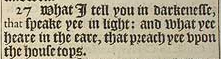 27 What I tell you in darkenesse, that speake yee in light: and what yee heare in the eare, that preach yee vpon the house tops.