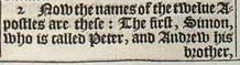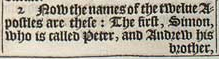 2 Now the names of the twelue Apostles are these: The first, Simon, who is called Peter, and Andrew his brother, Iames the sonne of Zebedee, and Iohn his brother: