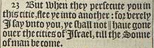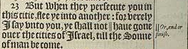23 But when they persecute you in this citie, flee ye into another: for verely I say vnto you, ye shall not || haue gone ouer the cities of Israel, till the Sonne of man be come.[||Or, end or finish.]