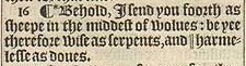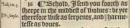 16 ¶ *Behold, I send you foorth as sheepe in the middest of wolues: be yee therefore wise as serpents, and || harmelesse as doues.[*Luk.10.3. , ||Or, simple.]