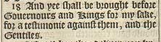 18 And yee shall be brought before Gouernours and Kings for my sake, for a testimonie against them, and the Gentiles.