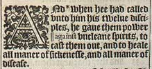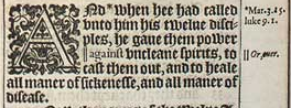 1 And *when hee had called vnto him his twelue disciples, he gaue them power ||against vncleane spirits, to cast them out, and to heale all maner of sickenesse, and all maner of disease.[*Mar.3.15. luke 9.1. ,||Or, ouer.]