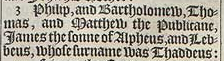 3 Philip, and Bartholomew, Thomas, and Matthew the Publicane, Iames the sonne of Alpheus, and Lebbeus, whose surname was Thaddeus: