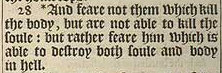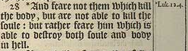 28 *And feare not them which kill the body, but are not able to kill the soule: but rather feare him which is able to destroy both soule and body in hell.[*Luk.12.4.]