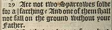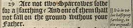 29 Are not two Sparrowes solde for a ||farthing? And one of them shall not fall on the ground without your Father.[||It is in value halfepeny far thing, in the originall: as being the tenth part of the Romane peny.]