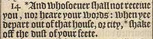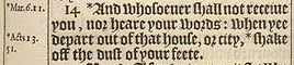 14 *And whosoeuer shall not receiue you, nor heare your words: when yee depart out of that house, or city, *shake off the dust of your feete.[*Mar.6.11. , Acts 13.51.]