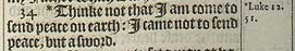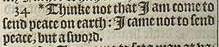 34 *Thinke not that I am come to send peace on earth: I came not to send peace, but a sword.[*Luke 12.51.]