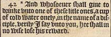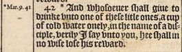 42 *And whosoeuer shall giue to drinke vnto one of these litle ones, a cup of cold water onely, in the name of a disciple, verily I say vnto you, hee shall in no wise lose his reward.[*Mar. 9. 41]