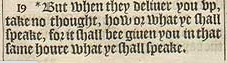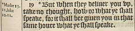 19 *But when they deliuer you vp, take no thought, how or what ye shall speake, for it shall bee giuen you in that same houre what ye shall speake.[*Marke 13.11. Luke 12.11.]