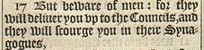 17 But beware of men: for they will deliuer you vp to the Councils, and they will scourge you in their Synagogues,