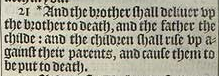 21 *And the brother shall deliuer vp the brother to death, and the father the childe: and the children shall rise vp against their parents, and cause them to be put to death.[*Luke 21.16.]