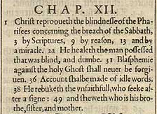 1 Christus tadelt die Blindheit der Pharisäer bezüglich des Brechens des Sabbats, 3 mit Schriften 9 mit Vernunft 13 und mit einem Wunder. 22 Er heilt den besessenen Mann, der blind und stumm war. 31 Lästerung gegen den Heiligen Geist kann nie vergeben werden. 36 Für unproduktive Werke wird Rechenschaft abgelegt werden. 38 Er weist die Ungläubigen zurück, die nach einem Zeichen suchen: 49 Und zeigt wer sein Bruder, seine Schwester und Mutter ist.