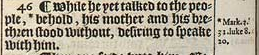 46 ¶ Während er zu den Leuten gesprochen hatte, *siehe, seine Mutter und seine Brüder standen draußen, mit ihm zu sprechen begehrend.[*Markus 3:31 Lukas 8:20]