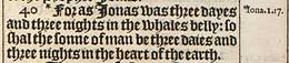 40 *For as Ionas was three dayes and three nights in the whales belly: so shal the sonne of man be three daies and three nights in the heart of the earth. [*Iona.1.17.]