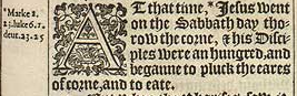 1 At that time, *Iesus went on the Sabbath day thorow the corne, & his Disciples were an hungred, and beganne to pluck the eares of corne, and to eate.[*Marke 2. 23. luke 6. 1. deut. 23. 25]
