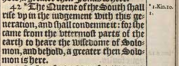 42 *The Queene of the South shall rise vp in the iudgement with this generation, and shall condemne it: for she came from the vttermost parts of the earth to heare the wisedome of Solomon, and behold, a greater then Solomon is here.[*1.Kin.10.1.]