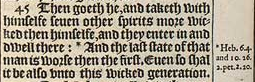 45 Then goeth he, and taketh with himselfe seuen other spirits more wicked then himselfe, and they enter in and dwell there: *And the last state of that man is worse then the first. Euen so shal it be also vnto this wicked generation.[ Heb. 6.4. and 10.26. 2.pet.2.20.]