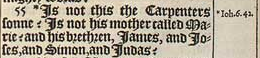 55 *Is not this the Carpenters sonne? Is not his mother called Marie? and his brethren, Iames, and Ioses, and Simon, and Iudas?[*Ioh.6.42.]