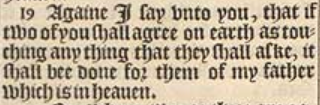 19 Againe I say vnto you, that if two of you shall agree on earth as touching any thing that they shall aske, it shall bee done for them of my father which is in heauen.