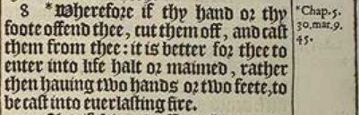 8 *Wherefore if thy hand or thy foote offend thee, cut them off, and cast them from thee: it is better for thee to enter into life halt or maimed, rather then hauing two hands or two feete, to be cast into euerlasting fire.[*Chap.5.30. mar.9.45.]