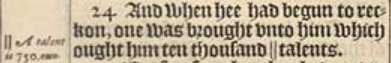 24 And when hee had begun to reckon, one was brought vnto him which ought him ten thousand || talents.[|| A talent is 750. ounces of siluer, which after fiue shillings the ounce, is 187.li.10.s.]