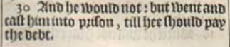30 And he would not: but went and cast him into prison, till hee should pay the debt.