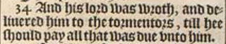 34 And his lord was wroth, and deliuered him to the tormentors, till hee should pay all that was due vnto him.
