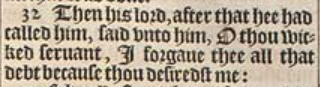 32 Then his lord, after that hee had called him, said vnto him, O thou wicked seruant, I forgaue thee all that debt because thou desiredst me: