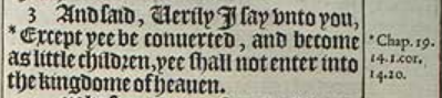 3 And said, Uerily I say vnto you, *Except yee be conuerted, and become as little children, yee shall not enter into the kingdome of heauen.[*Chap.19.14. 1.cor.14.20.]