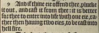 9 And if thine eie offend thee, plucke it out, and cast it from thee: it is better for thee to enter into life with one eie, rather then hauing two eies, to be cast into hell fire.