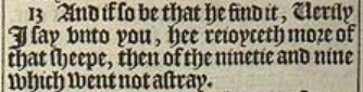 13 And if so be that he find it, Uerily I say vnto you, hee reioyceth more of that sheepe, then of the ninetie and nine which went not astray.