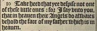 10 Take heed that yee despise not one of these little ones: for I say vnto you, that in heauen their Angels do alwaies behold the face of my father which is in heauen.
